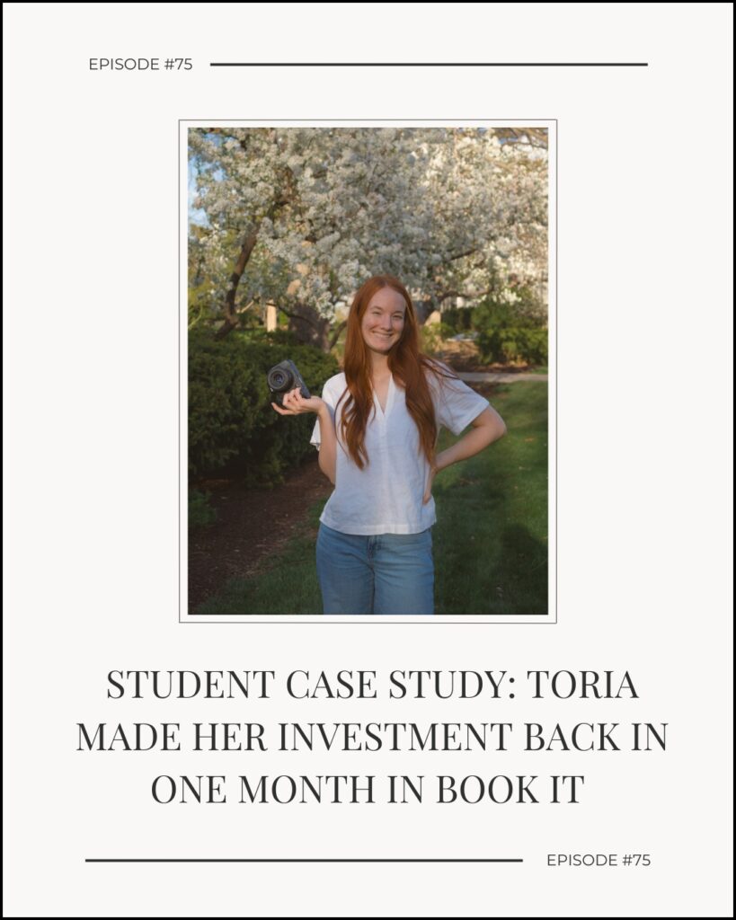Have you been scrolling through Facebook wedding groups, posting “I’ll shoot your wedding” comments and hoping someone picks you out of hundreds of other photographers? Are you tired of accepting any client just for the income, even when they’re not your ideal fit? You’re not alone, friend. In today’s episode, I’m sharing the incredible transformation story of my Book It student, Toria, who went from posting in Facebook groups to booking five lead weddings and making back her entire program investment in just one month. If you’ve been piecing together free education but still aren’t seeing the consistent growth you want, this episode will show you exactly what’s possible when you finally invest in your business foundations. Listen to the episode below, or keep reading for a summary of what’s covered.