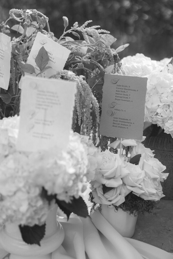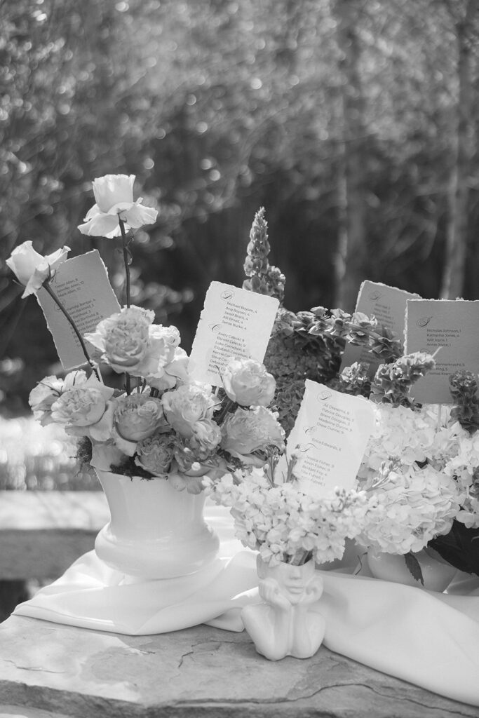 One of my favorite things about a wedding day is that I do not go in with pre-planned photos for inspiration or use someone else’s day as a template for yours. It’s always a surprise being inspired by my couples and this vase and face statue table seating chart was no exception.